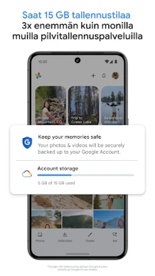 Google Kuvat on kehitetty mullistamaan tapasi tallentaa, järjestellä ja kokea elämäsi hetkiä. Se tarjoaa vaivattoman ratkaisun kaikkien rakkaiden muistojesi hallintaan, pitäen ne turvassa ja helposti saatavilla kaikilta laitteiltasi. Jokainen Google-tili sisältää runsaat 15 Gt maksutonta tallennustilaa*, mikä ylittää monien muiden palveluntarjoajien tarjoaman kapasiteetin. Tämä tarkoittaa, että voit huoletta varmuuskopioida kaikki kuvasi ja videosi, vapauttaen samalla arvokasta tilaa puhelimestasi yhdellä napautuksella.