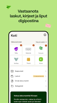 Kuvittele arki, jossa kaikki tärkeät asiakirjat löytävät sinut vaivattomasti, suoraan puhelimeesi tai selaimeesi. Kivra tekee tästä totta tarjoamalla keskitetyn ja älykkään ratkaisun digitaalisen postin hallintaan. Rekisteröitymisen jälkeen alat vastaanottaa automaattisesti virallisia ilmoituksia, laskuja ja muita tärkeitä viestejä sinua palvelevilta yrityksiltä ja organisaatioilta. Kivra varmistaa, ettet unohda mitään – saat ajantasaiset ilmoitukset uudesta postista ja lähestyvistä eräpäivistä, olitpa sitten liikkeellä Kivran mobiilisovelluksen parissa tai tietokoneen ääressä osoitteessa www.kivra.fi.