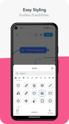 Vapauta luovuutesi potentiaali intuitiivisten työkalujen avulla. MindMeister tarjoaa rajattomat mahdollisuudet muokata ja muotoilla ajatuksiasi vedä ja pudota -toiminnolla, sujuvilla zoomaus- ja panorointitoiminnoilla. Rikasta karttojasi monipuolisilla ikoneilla, väreillä, tyyleillä ja teemoilla, luoden ainutlaatuisia esityksiä, jotka todella heijastavat visiotasi. Syvennä jokaista ideaa liittämällä siihen muistiinpanoja, linkkejä, tehtäviä ja tiedostoja, muuttaen abstraktit ajatukset konkreettisiksi suunnitelmiksi. MindMeister tekee yhteistyöstä reaaliaikaista ja saumatonta; jaa karttoja vaivattomasti laitteestasi ja työskentele yhdessä tiimisi kanssa varmistaen, että kaikki ovat aina samalla sivulla.