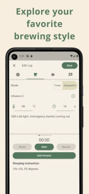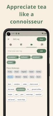 MyTeaPal muuttaa teekokemuksesi henkilökohtaiseksi päiväkirjaksi, joka on rikas yksityiskohdista. Voit järjestää kaikki teelaatusi, teetarvikkeesi, hankintapaikkasi ja ainesosasi, lisätä niihin omat kuvasi ja yksityiskohtaiset tiedot. Jokainen haudutus on mahdollisuus tarkkuuteen; hyödynnä sisäänrakennettua ajastinta tai sekuntikelloa varmistaaksesi ihanteellisen valmistuksen, valiten mittayksiköt oman makusi mukaan (ml/fl oz, °C/°F, g/tl/pussi/pallo). Kirjaa ylös jokaisen maistelun vivahteet, arvioi teelaadut viiden tähden asteikolla ja seuraa kulutustasi. MyTeaPalin avulla näet tilastot haudutuksistasi kalenterissa ja teekokoelmasi piirakkakaavioina, mikä tekee teematkastasi helposti visualisoitavan ja analysoitavan. Tutustu samalla teemaailman eri tyyleihin laajan teetietosanakirjan ja yli sadan makutagin avulla, tai luo omia tageja makusanastoon.