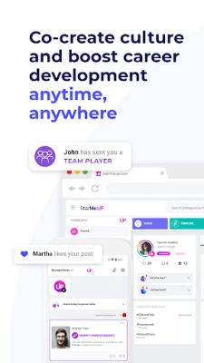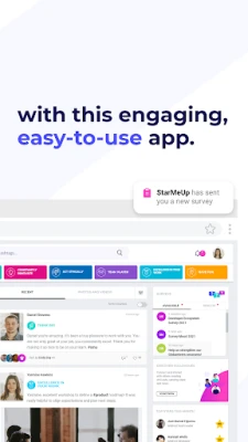 StarMeUpin avulla voit syventää yhteisöllisyyttä jakamalla merkityksellisiä hetkiä kuvien ja videoiden muodossa, mikä rikastaa sisäistä viestintää ja luo yhteisiä kokemuksia. Lisäksi alustamme antaa kaikille mahdollisuuden osallistua ja vaikuttaa äänensä kautta interaktiivisten kyselyjen avulla, varmistaen, että jokaisen mielipide otetaan huomioon. Nämä vuorovaikutukset muodostavat pohjan syvällisille näkemyksille ihmisten välisestä dynamiikasta ja yleisestä mielialasta, jotka ovat yrityksesi käytettävissä StarMeUpin verkkopalvelusta.