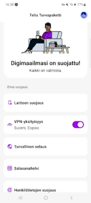 Telia Turvapaketti takaa huolettoman surffailun. Sen edistykselliset suojausmekanismit vartioivat digitaalista elämääsi, pitäen loitolla hakkereiden hyökkäykset, haitalliset sovellukset ja vaaralliset verkkosivustot. Voit hoitaa verkkopankkiasi ja tehdä ostoksia luottavaisin mielin. Lisäksi sisäänrakennettu VPN-palvelu kätkee jälkesi verkossa ja varmistaa yksityisyytesi. Entä jos laite katoaa? Ei hätää – Telia Turvapaketti auttaa sinua paikantamaan, lukitsemaan ja tarvittaessa tyhjentämään kadonneen laitteen sisällön, suojaten arkaluontoiset tietosi vääriin käsiin joutumiselta.
