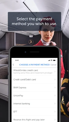 Valmistaudu tutkimaan maailmaa Turkish Airlinesin laajan reittiverkoston kautta. Selaamalla erikoistarjouksia löydät houkuttelevia hintoja, jotka tekevät unelmamatkoistasi totta. Tutustu kaupunkioppaiden suosituksiin, jotka rikastuttavat matkaasi tiedoilla vierailukohteista, paikallisista herkuista, lentokenttäkuljetuksista ja monesta muusta. Voit tallentaa lennot myöhempää varausta varten ja viimeistellä maksun joustavasti millä tahansa laitteellasi. Hallitse varauksiasi vaivattomasti "Omat varaukset" -osiossa, jossa voit lisätä uusia lentoja, muuttaa tai peruuttaa olemassa olevia ja lisätä matkustajia helposti. Turkish Airlines tekee maksamisestakin nopeaa ja turvallista useilla valuutta- ja maksutapavaihtoehdoilla. Voit nopeuttaa prosessia tallentamalla luottokorttitietosi tai skannaamalla kortin kameralla ja pitää samalla tietosi turvassa.