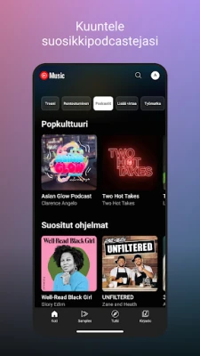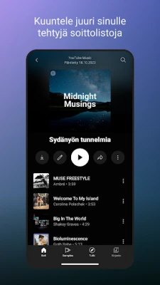 Sukella syvemmälle personoidun musiikkimaailman ytimeen. YouTube Music räätälöi soittolistat ja sekoitukset tarkasti sinun musiikkimakusi pohjalta, oppien jatkuvasti mieltymyksistäsi. Olipa kyseessä intensiivinen treeni, rentouttava hengähdyshetki tai syvää keskittymistä vaativa tehtävä, löydät juuri oikean ääniraidan. Rakenna unelmiesi soittolistat älykkäiden kappale-ehdotusten avulla tai tee se yhdessä muiden musiikin ystävien kanssa. Pysy ajan tasalla uusista tuulista kuuntelemalla henkilökohtaisesti valittuja "Löydöt" ja "Uudet julkaisut" -sekoituksia. Tutki musiikkia laajasti eri genreistä ja fiilispohjaisesti, vaikkapa chillaamiseen, energiabuustiin tai bileisiin, ja seuraa maailmanlaajuisia hittilistoja. Oma kirjastosi kokoaa puolestaan kaikki tykätyt kappaleesi, soittolistasi, artistisi ja albumisi helppoon näkymään.